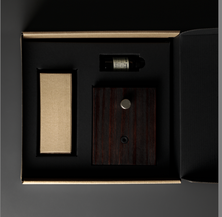 The diffuser’s wooden base is crafted from carefully chosen European balsam wood, selected for its age and durability, then hand-cut and polished. Each base showcases its own naturally occurring wood grain pattern, a nod to the philosophy of wabi-sabi—finding beauty in subtle imperfections and the passage of time.